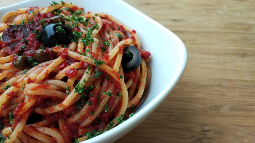 Ein würziger Nudelklassiker aus Süditalien mit einer aromatischen Sauce aus Tomaten, Oliven, Kapern und Sardellen. Schnell zubereitet und voller Geschmack.