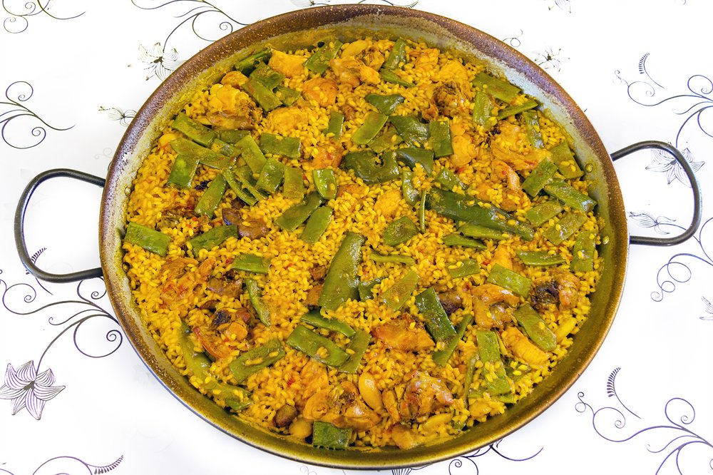 Der berühmte Reisklassiker aus Valencia mit Huhn, Kaninchen und typischem Gemüse. In der speziellen flachen Pfanne gegart, entwickelt der Reis sein volles Aroma und die begehrte Kruste.