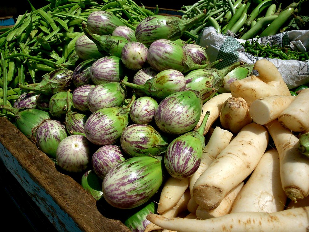 Baby Brinjal und weiteres Gemüse in Südindien – Foto: Dahivada (Diskussion) 10:23, 1 (CC BY-SA 3.0 DE)