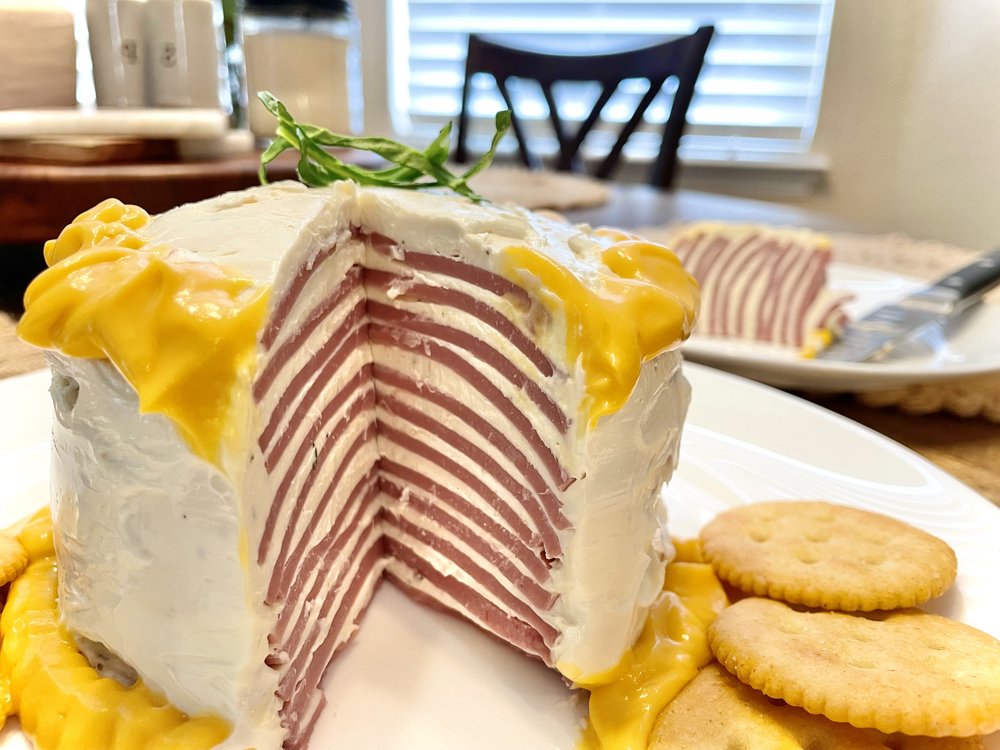 Ein salzig-cremiger Party-Hit aus den USA: Schichten von Bologna und gewürztem Frischkäse, dekoriert mit Käsesauce und Oliven. Perfekt zu Crackern – humorvoll, preiswert und überraschend lecker!
