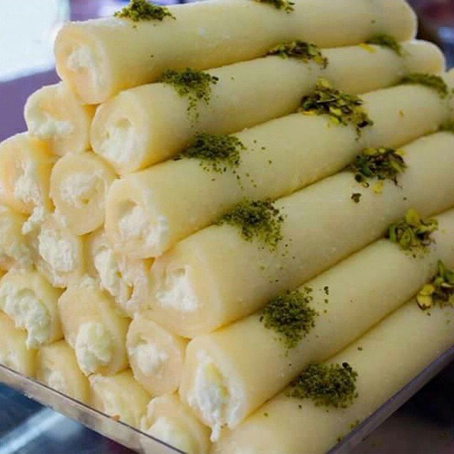 Goldbraun gebackene Filoteig-Dreiecke mit einer cremigen Füllung aus Milchpudding (Ashta), getränkt in aromatischem Zuckersirup. Ein unwiderstehliches Dessert aus der Levante, das besonders zu festlichen Anlässen serviert wird.