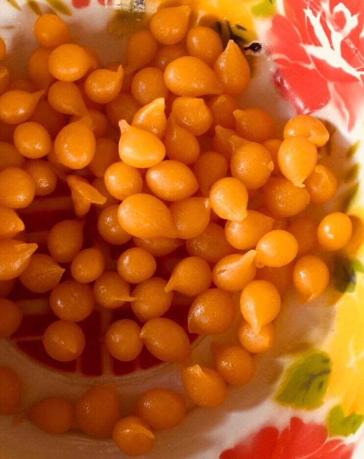 Lasse die Tropfen im sanft siedenden Zuckersirup garziehen, bis sie vollständig durchgekocht sind und eine leuchtend goldene Farbe annehmen.