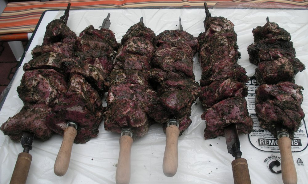 Grillen: Die Fleischstücke auf Spieße stecken. Traditionell über offenem Birkenholzfeuer oder auf einem Grill mit Drehspieß ca. 1,5 bis 2 Stunden garen, bis das Fleisch durchgebraten und außen dunkelbraun ist.