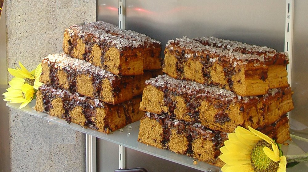 Ein traditioneller niederländischer Honigkuchen aus der Region Betuwe, der mit Roggenmehl und reichlich Honig gebacken wird. Charakteristisch ist die knusprige Kruste aus Hagelzucker auf dem saftigen, dunklen Teig.