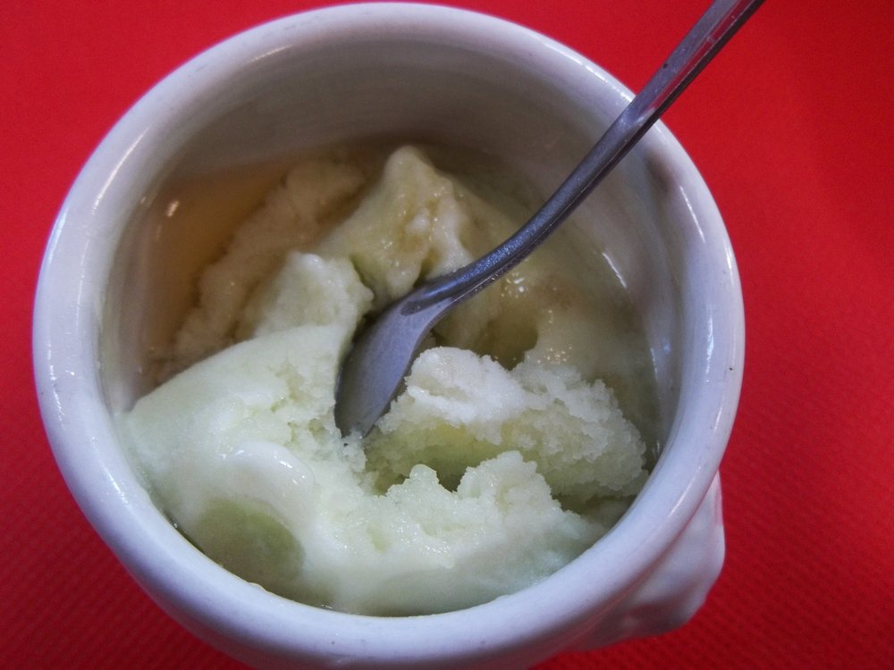 Ein traditioneller normannischer Zwischengang zur Erfrischung und Verdauungsförderung. Das grüne Apfelsorbet wird mit einem Schuss Calvados serviert, um Platz für den nächsten Gang zu schaffen.