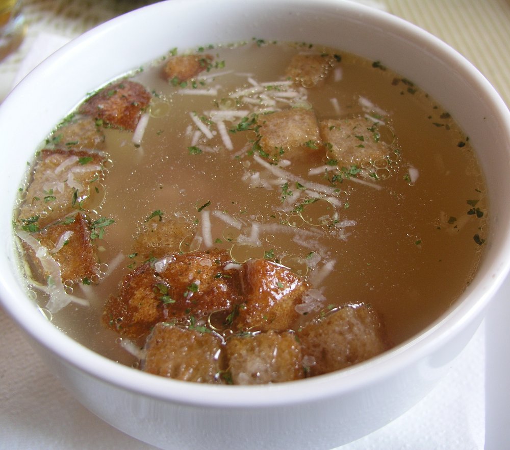 Zum Servieren den optionalen geriebenen Käse in tiefe Teller geben, mit der heißen Suppe übergießen (damit der Käse schmilzt) und reichlich mit den Brotwürfeln bestreuen.
