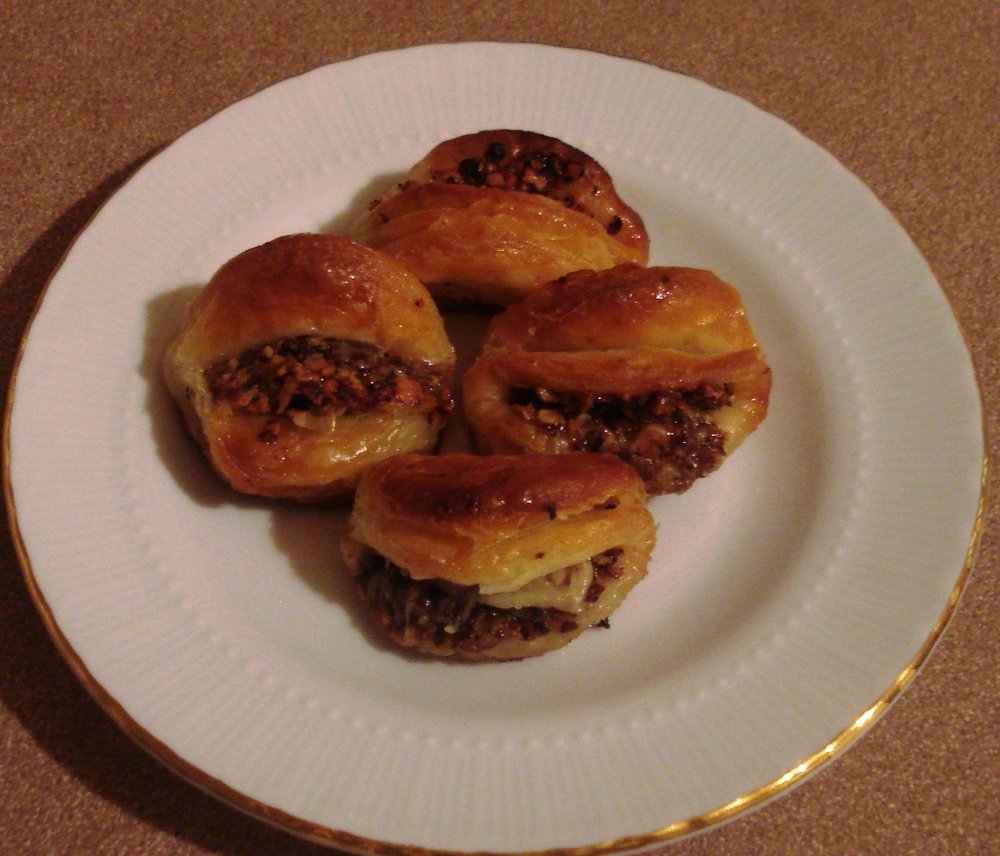 In die Mitte jedes Kreises etwas Walnussfüllung geben und den Teig zu einem Halbmond zusammenklappen (nicht festdrücken, damit sich die 'Lippen' beim Backen öffnen).