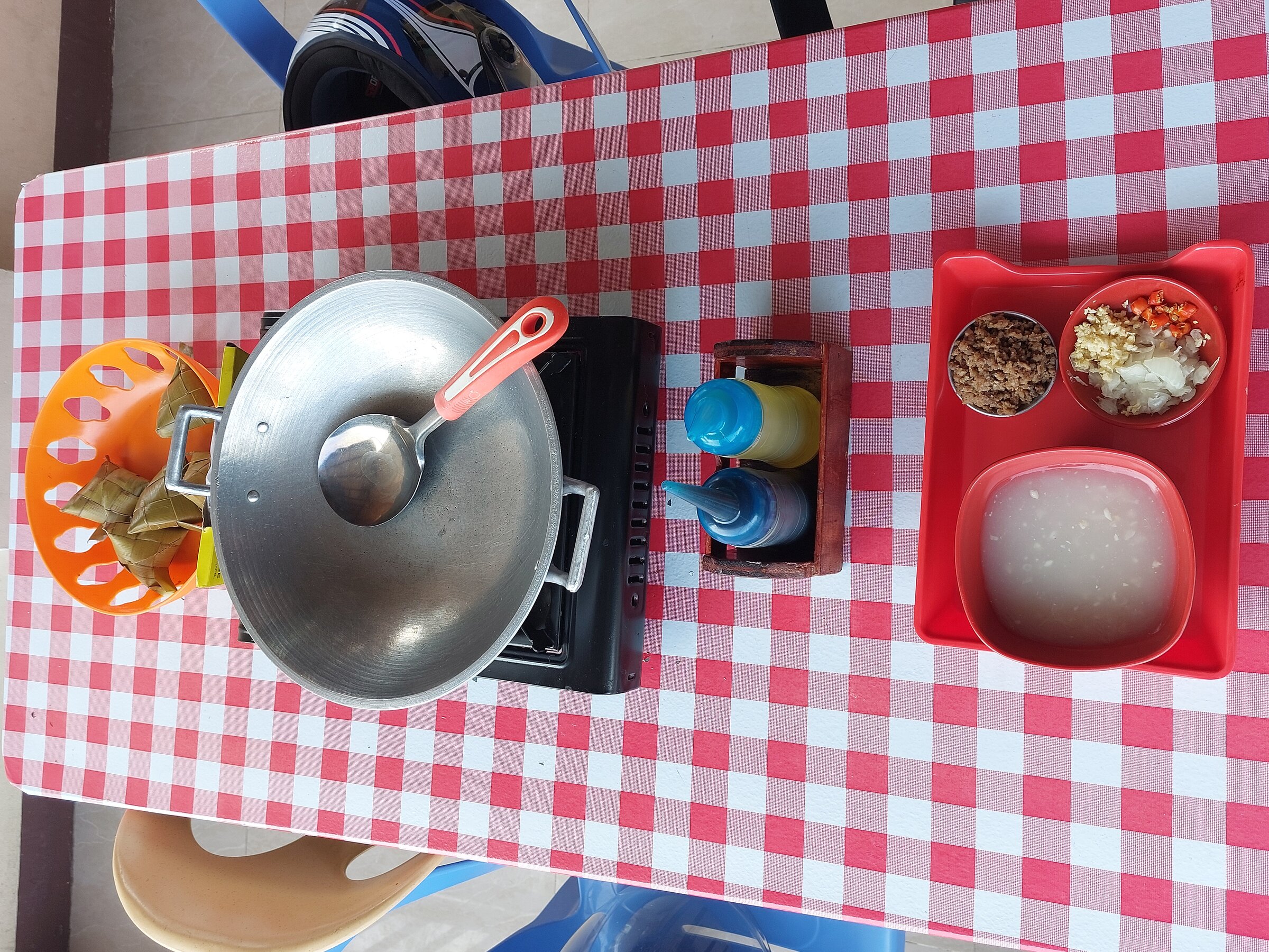 Stelle die Pusô (Reisbündel) griffbereit, da das Gericht später sofort kochend heiß aus dem Wok gegessen wird.