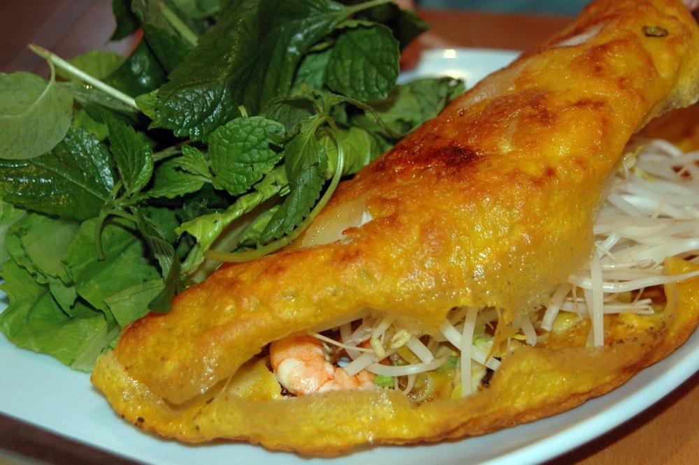Knusprige vietnamesische Reismehl-Pfannkuchen, die durch Kurkuma ihre charakteristische gelbe Farbe erhalten. Gefüllt mit Schweinebauch, Garnelen und Sojasprossen werden sie traditionell in Salatblätter gewickelt und mit Kräutern genossen.