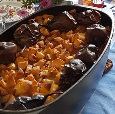 Ein traditioneller rheinhessischer Kartoffelauflauf mit mariniertem Schweinefleisch und Wein. Das Gericht wird langsam im Ofen gegart, bis das Fleisch zart ist.