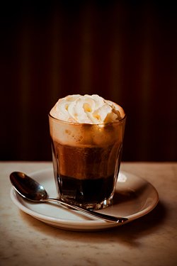 Die Sahnehaube vorsichtig mit einem Löffel auf den heißen Kaffee setzen.