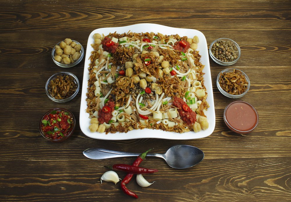 Das ägyptische Nationalgericht ist ein sättigender Mix aus Reis, Linsen, Nudeln und Kichererbsen. Getoppt wird es mit einer würzigen Tomatensauce, Knoblauchessig und knusprigen Röstzwiebeln.