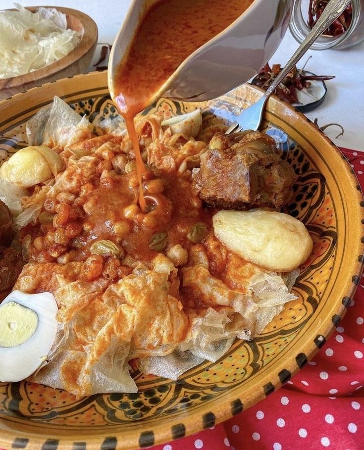 Ein herzhaftes, traditionelles Festtagsgericht aus Algerien, bei dem zerrissene, hauchdünne Grießfladen mit einer würzigen Tomaten-Fleisch-Sauce und Kichererbsen serviert werden. Besonders beliebt ist diese Spezialität in der Region Biskra.