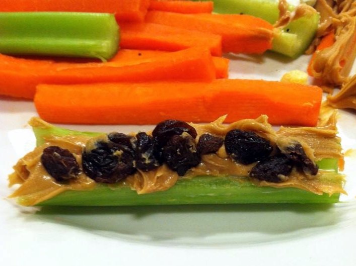 Die Rosinen als „Ameisen“ auf die Erdnussbutter setzen – je nach Geschmack mehr oder weniger.
