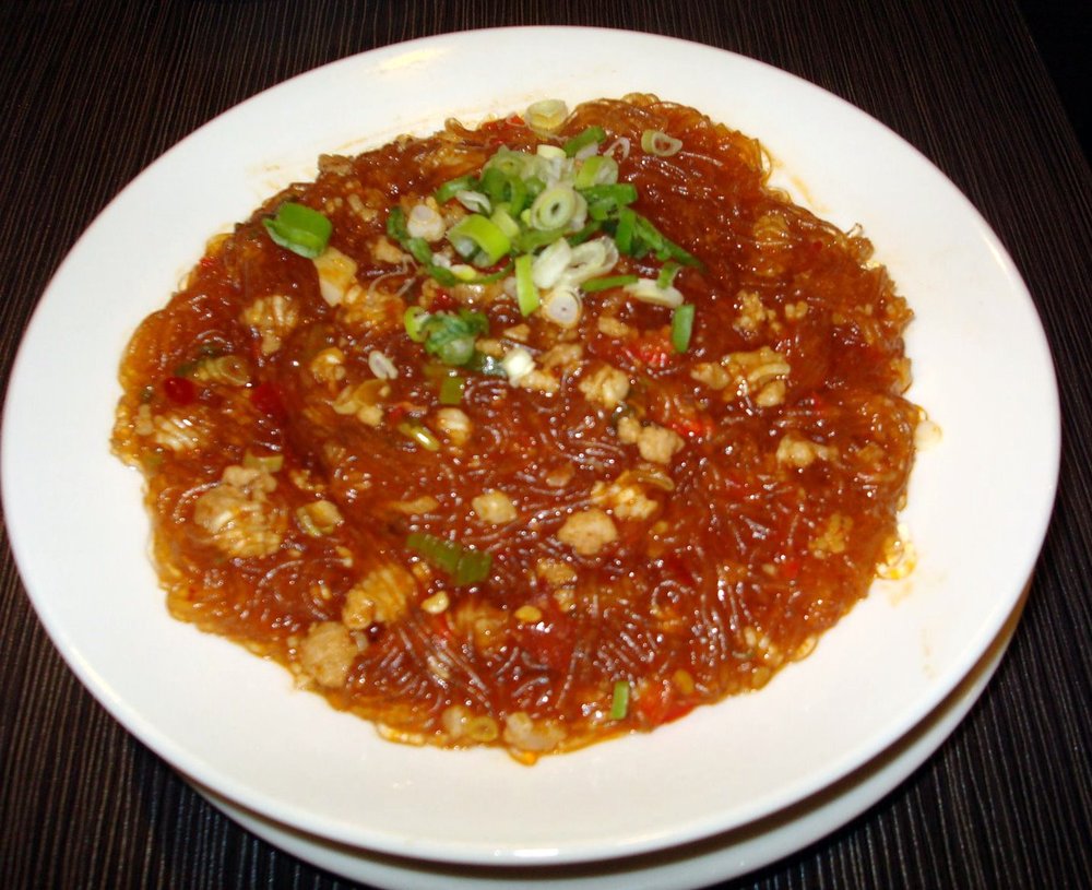 Ein klassisches Sichuan-Gericht mit würzigem Hackfleisch, das an Glasnudeln klebt – wie Ameisen auf Ästen. Die Nudeln saugen die würzige Soße auf und werden mit Knoblauch, Ingwer und Chili verfeinert.