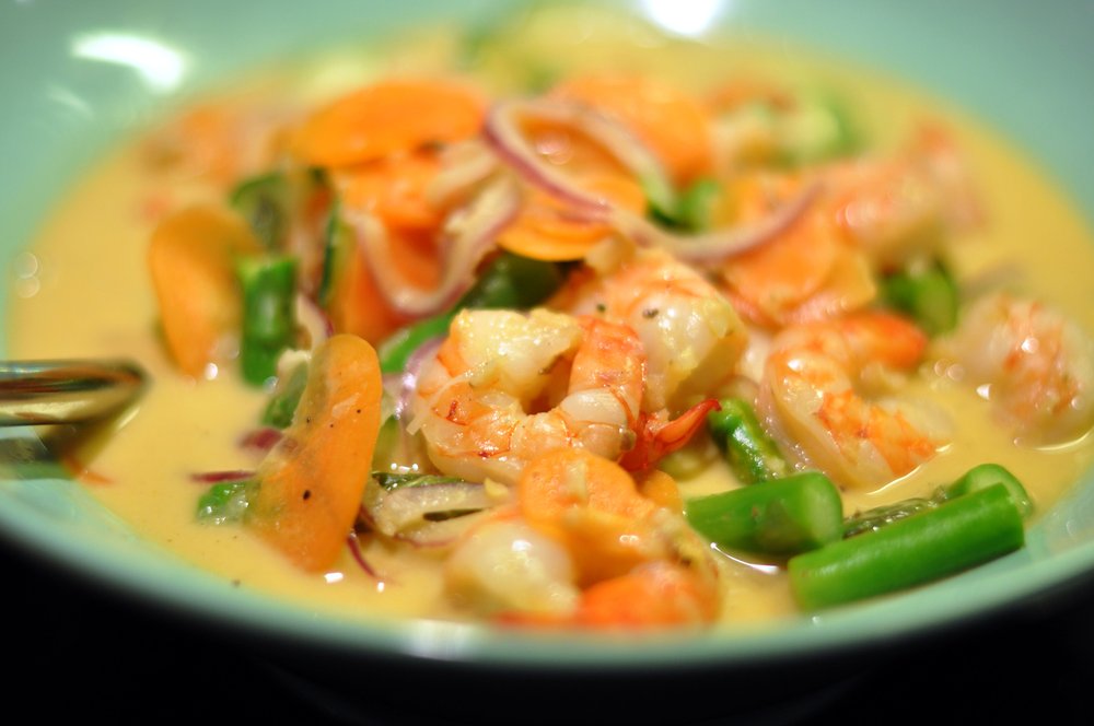 Grøntsager og tigerrejer i rød karry (4477230448) – Foto: cyclonebill from Copenhagen, Denmark (CC BY-SA 2.0)