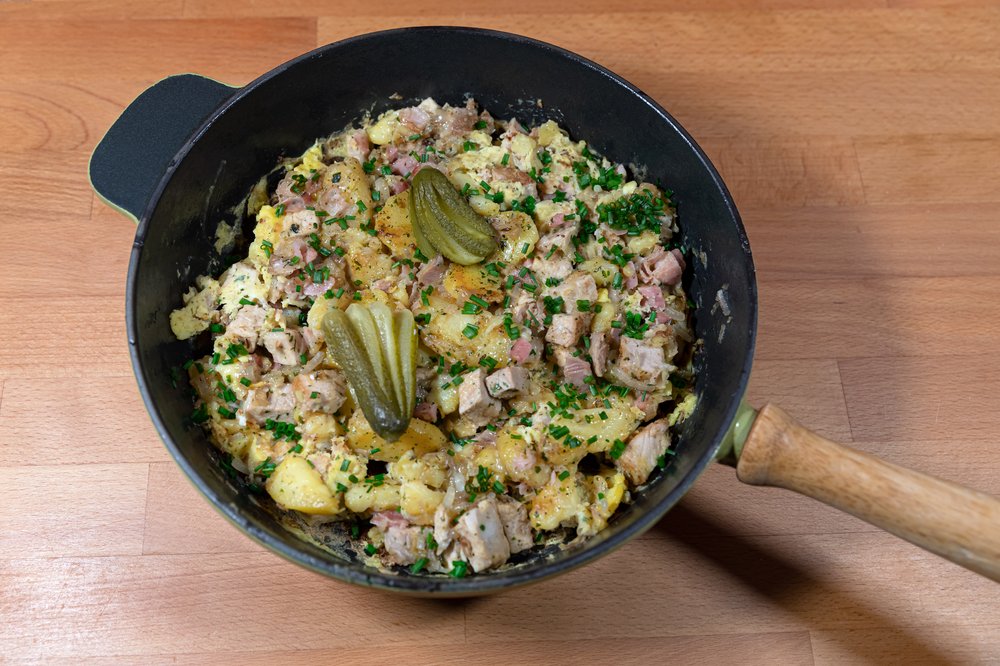 Ein deftiges österreichisches Pfannengericht aus Röstkartoffeln, Fleischstücken und Speck, verfeinert mit Majoran und Kümmel. Traditionell wird dieser Hüttenklassiker mit einem Spiegelei serviert.