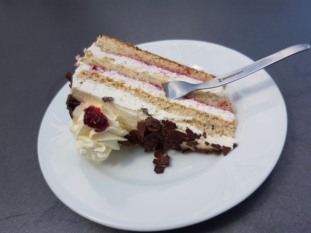 Eine feine, regionale Torte aus Buchweizenmehl und Heidehonig, geschichtet mit Cranberry-Joghurt-Füllung und verziert mit Schlagsahne und Schokoraspeln. Ein süßer Genuss, der die Natur der Lüneburger Heide auf den Teller bringt.