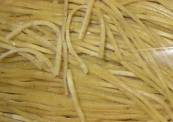 Fasse die gepressten Nudeln vorsichtig zu handtellergroßen Bündeln zusammen. Lasse diese Nudelbündel leicht antrocknen, bis sie fest und lagerfähig sind.