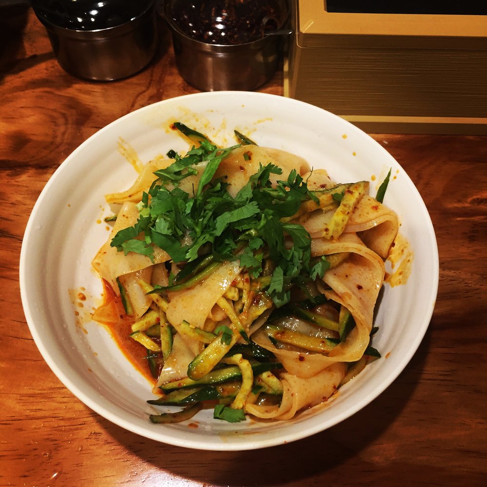 Ein traditionelles Gericht aus der Provinz Shaanxi, bei dem Weizenstärke und Gluten getrennt verarbeitet werden. Die glatten, kühlen Nudeln werden mit schwammigem Seitan und einer würzigen Sauce serviert.
