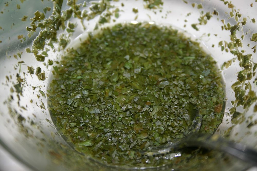 Die Minze gründlich waschen, trocken schütteln, die Blätter von den Stielen zupfen und sehr fein hacken.