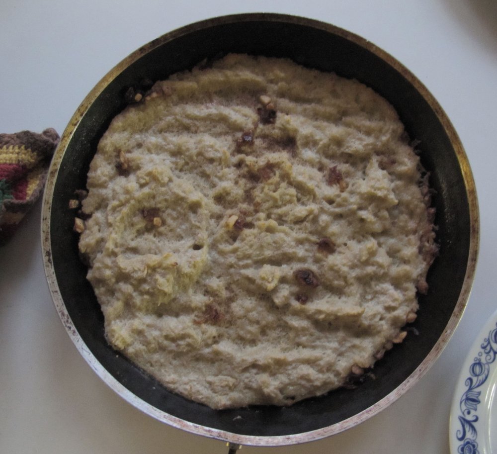 Die Kartoffel-Buttermilch-Masse in die heiße Form geben und glatt streichen. Die Höhe sollte etwa 2-3 cm betragen.