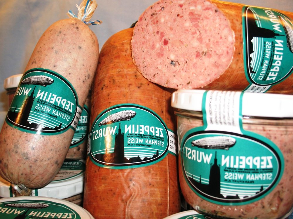 Die Zeppelinwurst ist eine geschützte Marke des Frankfurter Metzgermeisters Stephan Weiss, der sie 1909 kreierte. Inspiriert von seiner Dienstzeit unter Ferdinand Graf von Zeppelin und der Begeisterung für Luftschiffe, benannte er seine beliebte grobe Leberwurst nach dem berühmten Grafen.