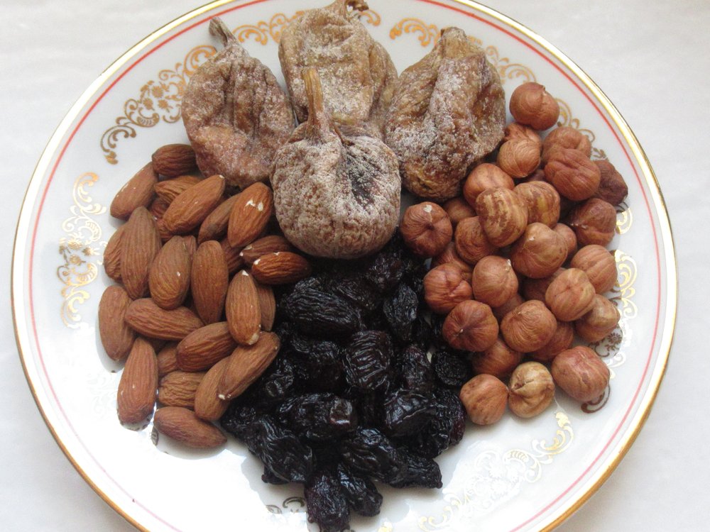 Solange die Schokolade noch flüssig ist, jeden Taler mittig mit je einer Mandel, einer Haselnuss, einer Rosine und einem Stück Feige belegen.