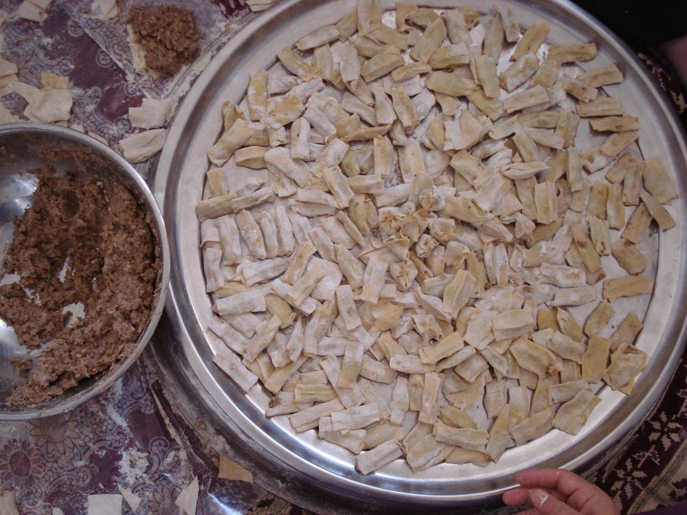 Teig in kleine Stücke teilen und jedes zu einem dünnen, runden Blatt ausrollen. In die Mitte je eine Portion Füllung geben, zu Dreiecken oder Vierecken falten und die Ränder gut andrücken, damit sie beim Kochen nicht aufgehen.