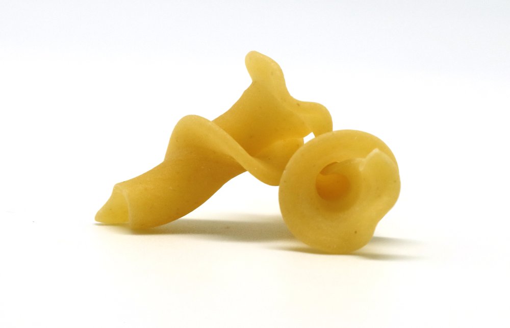 Campanelle, was auf Italienisch 'Glöckchen' oder 'Glockenblumen' bedeutet, sind eine dekorative Nudelsorte mit gewelltem Rand und hohler Mitte. Diese Form erinnert an eine kleine Blüte und ist besonders gut geeignet, um dicke, cremige Saucen aufzunehmen, da sich die Sauce wunderbar im Inneren und an den Rändern der Nudel festsetzt.