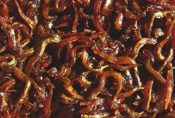 Ikanago no Kugini ist ein traditionelles Frühlingsgericht aus der Präfektur Hyogo. Der Name 'Kugini' bedeutet wörtlich 'gekochte Nägel', da die fertigen, dunkelbraun karamellisierten und leicht gebogenen Fische an rostige Nägel erinnern.