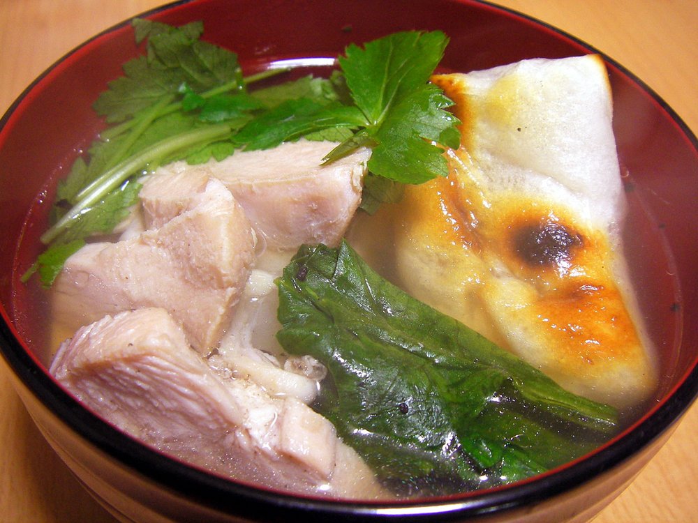 Eine traditionelle japanische Suppe, die besonders zum Neujahrstag serviert wird. Die klare Brühe enthält gegrillte Mochi-Reiskuchen, zartes Hähnchen und Gemüse.