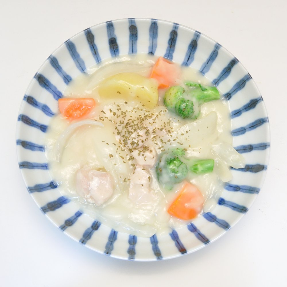 Ein wärmender, cremiger Eintopf aus der japanischen Yōshoku-Küche. Zartes Hühnchen und buntes Gemüse werden in einer milden weißen Sauce serviert.
