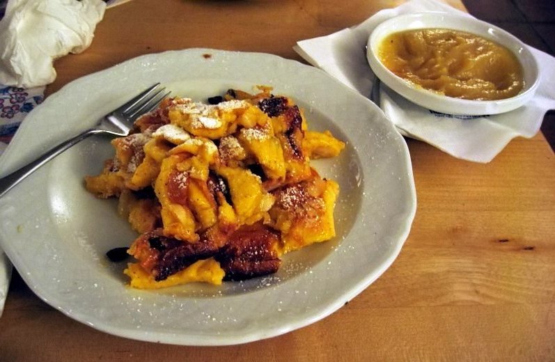 Eine weltberühmte österreichische Mehlspeise aus luftigem Pfannkuchenteig, der in der Pfanne zerteilt und karamellisiert wird. Serviert mit Puderzucker und traditionell mit Zwetschgenröster.