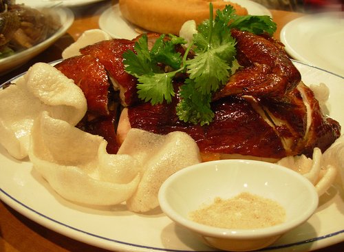 Ein legendäres Gericht der Shandong-Küche, bekannt als 'Huhn ohne Knochen', da das Fleisch nach stundenlangem Schmoren förmlich vom Knochen fällt. Das Hähnchen wird erst frittiert, um die Haut zu versiegeln, und dann in einem aromatischen Sud gegart.