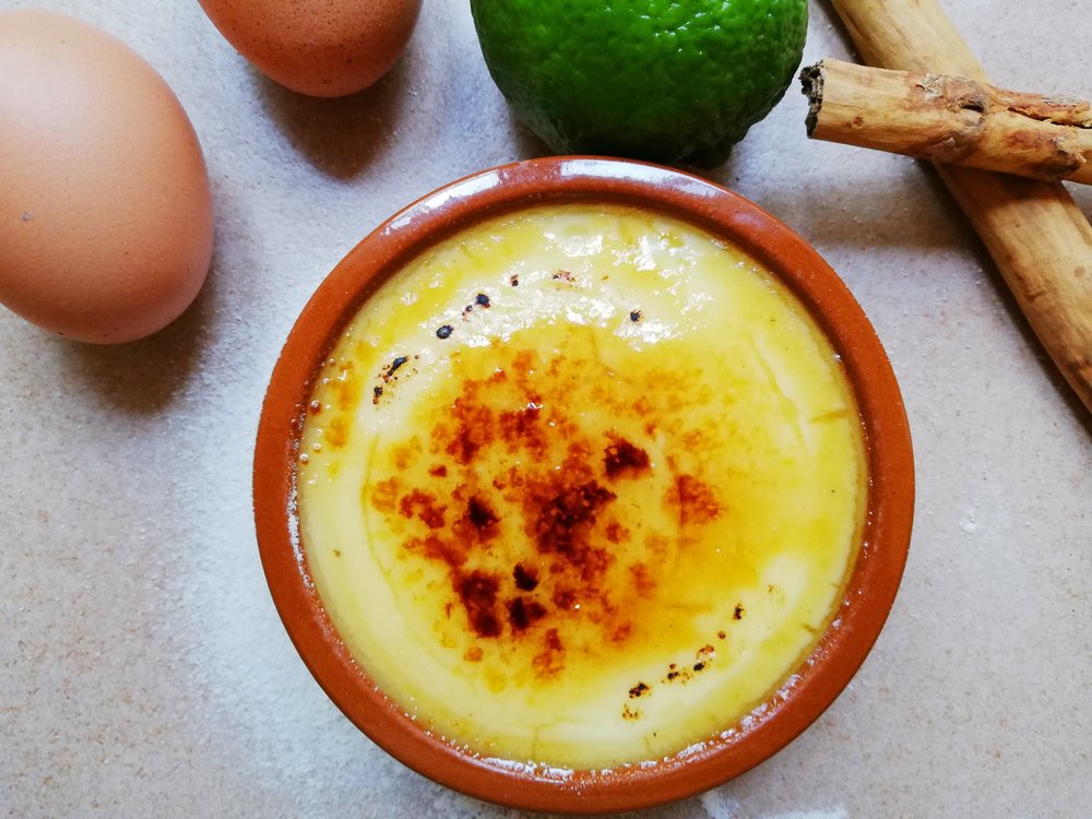 Dieser spanische Dessertklassiker besticht durch seine feine Zitrus-Zimt-Note und die knackige Karamellkruste. Im Gegensatz zur Crème brûlée wird sie traditionell mit Milch und Stärke statt Sahne zubereitet.