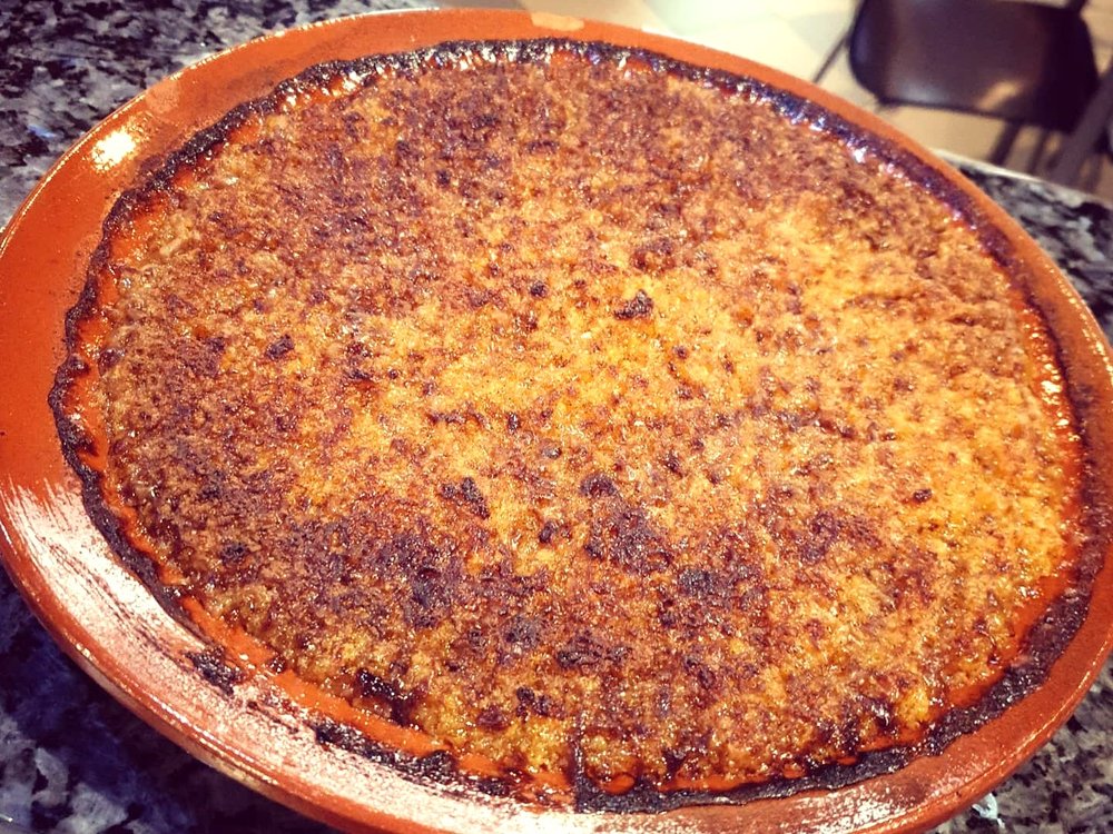Die Encharcada in eine Servierschale oder Auflaufform füllen. Traditionell wird sie nun im Ofen kurz überbacken oder mit einem Bunsenbrenner an der Oberfläche leicht karamellisiert, um braune Spitzen zu erzeugen.