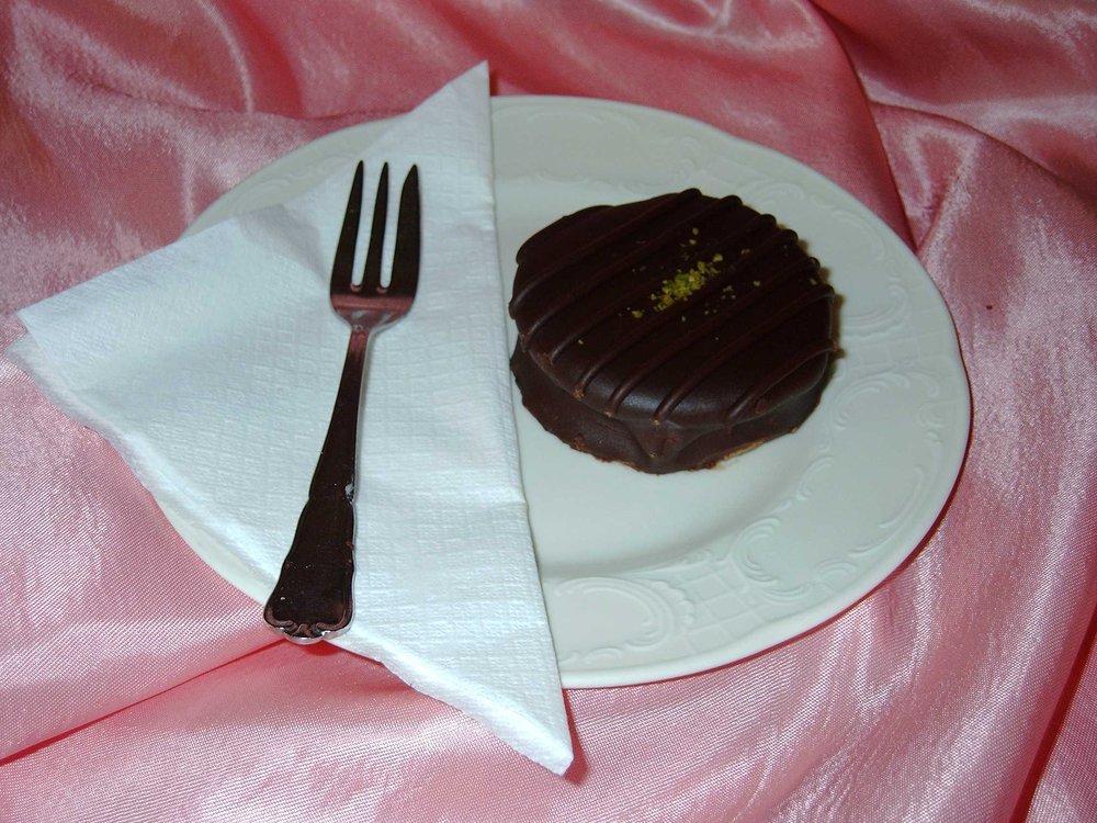 Ein edles österreichisches Teegebäck aus zartem Mürbeteig mit einer reichen Schokoladencremefüllung. Klassisch glasiert und mit Pistazien garniert, sind sie ein Highlight der Konditoreikunst.