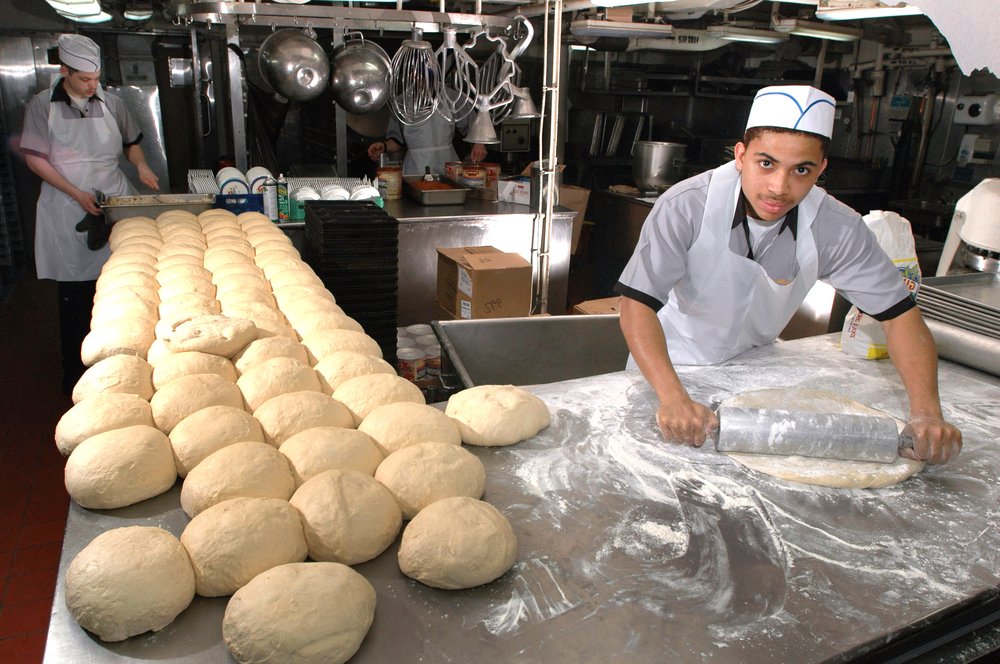 US Navy 060602-N-1332Y-025 Culinary Specialist Seaman D'arco Tolliver assigned aboard the USS Kitty Hawk (CV 63), rolls pizza dough in preparation of a celebration for 273 recently promoted Sailors – Foto: U.S. Navy photo by Photographe (PUBLIC DOMAIN)