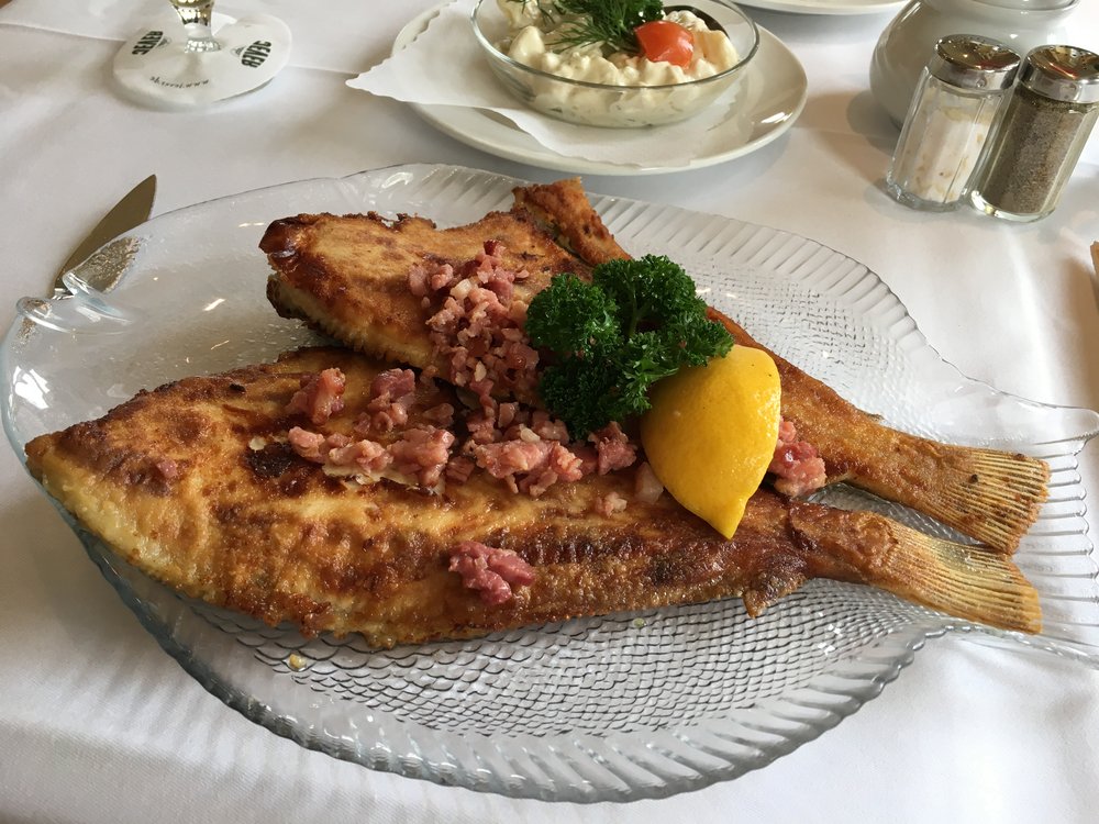 Ein norddeutscher Klassiker aus dem Hamburger Fischerdorf Finkenwerder. Zarte, in der Pfanne gebratene Scholle wird traditionell mit einer herzhaften Garnitur aus krossem Speck und Zwiebeln serviert.