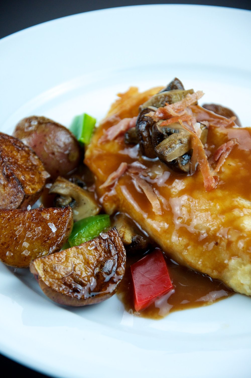 Ein traditionelles französisches Gericht, auch bekannt als 'Jägerart'. Zartes Hähnchen schmort in einer aromatischen Sauce aus Pilzen, Schalotten, Weißwein und Kräutern.