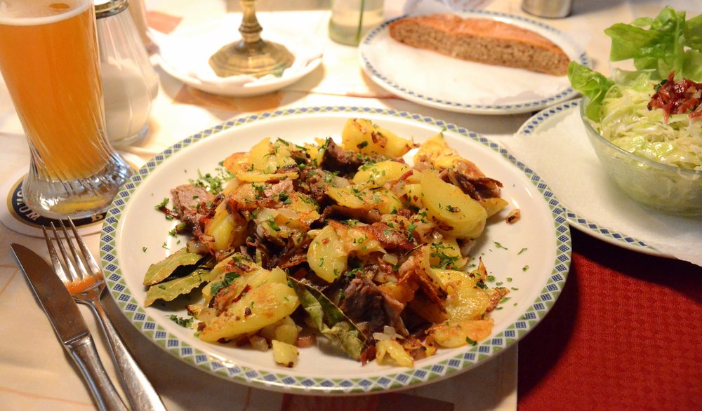Ein deftiges österreichisches Pfannengericht aus Röstkartoffeln, Fleischstücken und Speck, verfeinert mit Majoran und Kümmel. Traditionell wird dieser Hüttenklassiker mit einem Spiegelei serviert.