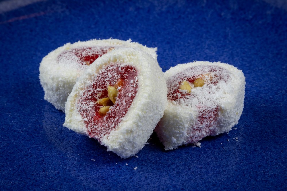 Eine traditionelle Süßigkeit aus der türkischen Küche, bekannt für ihre weiche, geleeartige Konsistenz. Aromatisiert mit Rosenwasser und verfeinert mit Puderzucker, ist es der perfekte Begleiter zu starkem Kaffee.