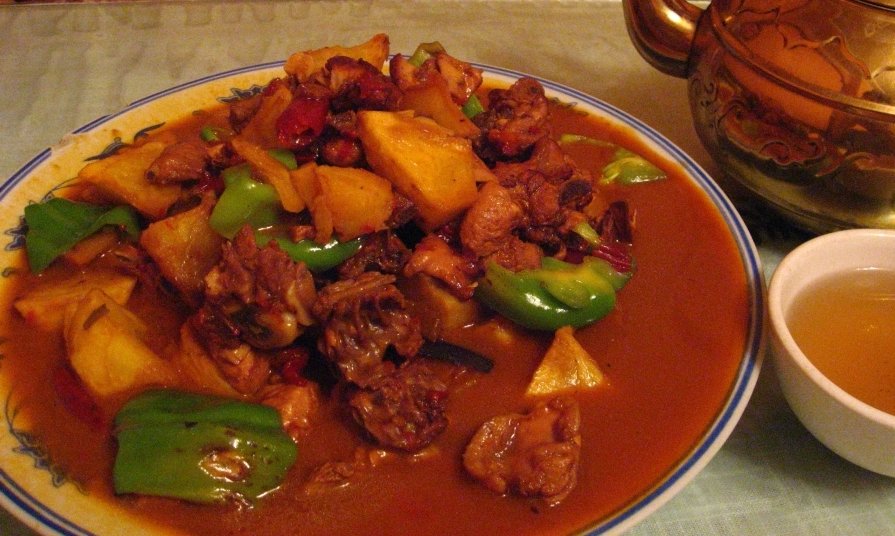 Ein berühmter, würziger Hähnchen-Eintopf aus Xinjiang mit Kartoffeln, Paprika und handgezogenen Nudeln. Dieses Gericht vereint feurige Sichuan-Aromen mit herzhaften Zutaten.
