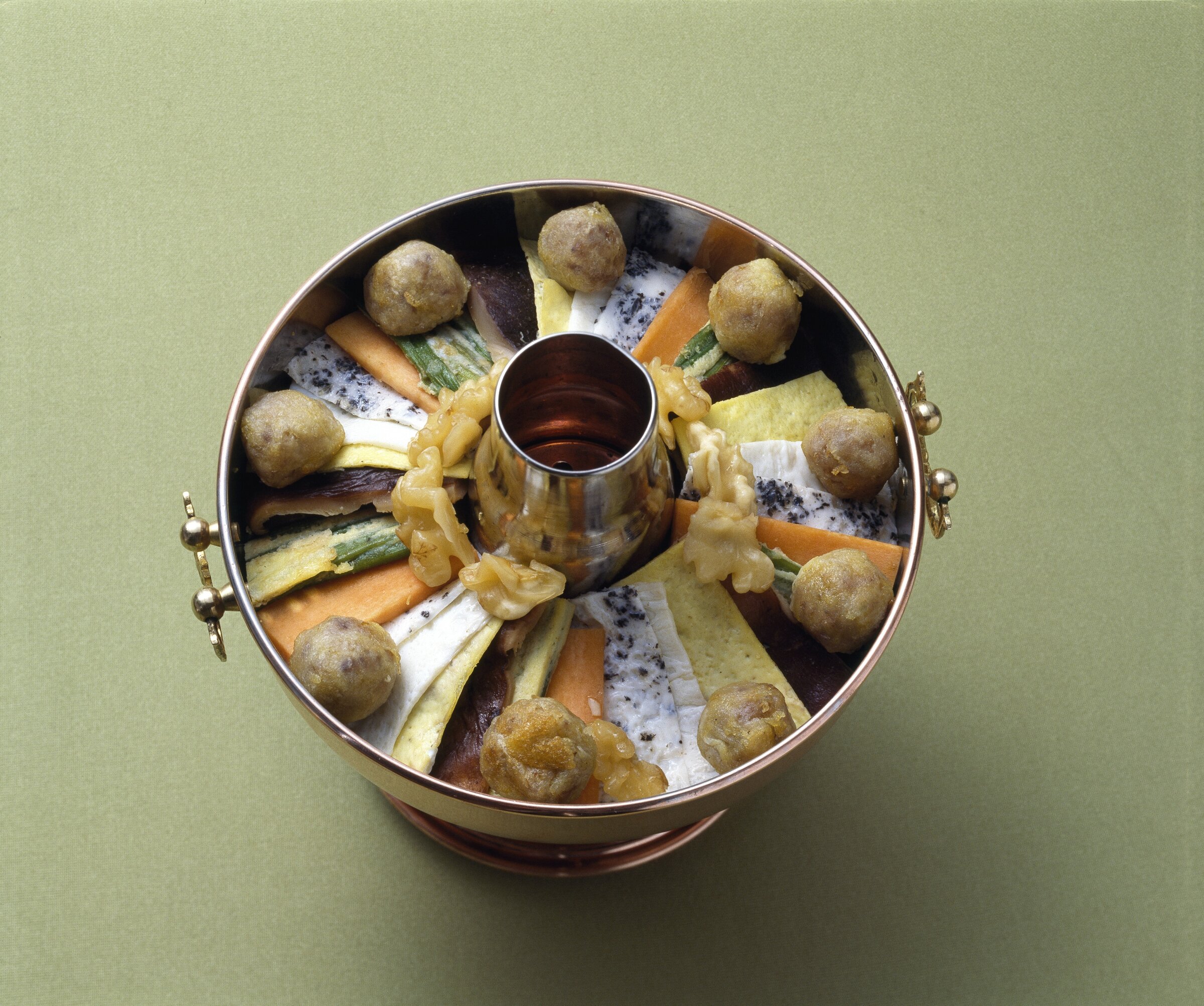 Ein prachtvolles Gericht der koreanischen Hofküche, serviert in einem speziellen Topf mit zentralem Kamin. Bis zu 25 Zutaten wie Rindfleisch, Fischbällchen, Meeresfrüchte und buntes Gemüse werden kunstvoll arrangiert und in einer reichen Brühe am Tisch geköchelt.