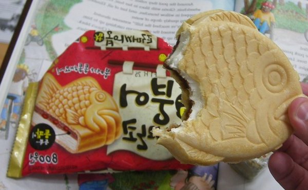Ein beliebtes koreanisches Streetfood-Gebäck in Fischform. Der außen knusprige und innen weiche Waffelteig ist traditionell mit süßer roter Bohnenpaste gefüllt.