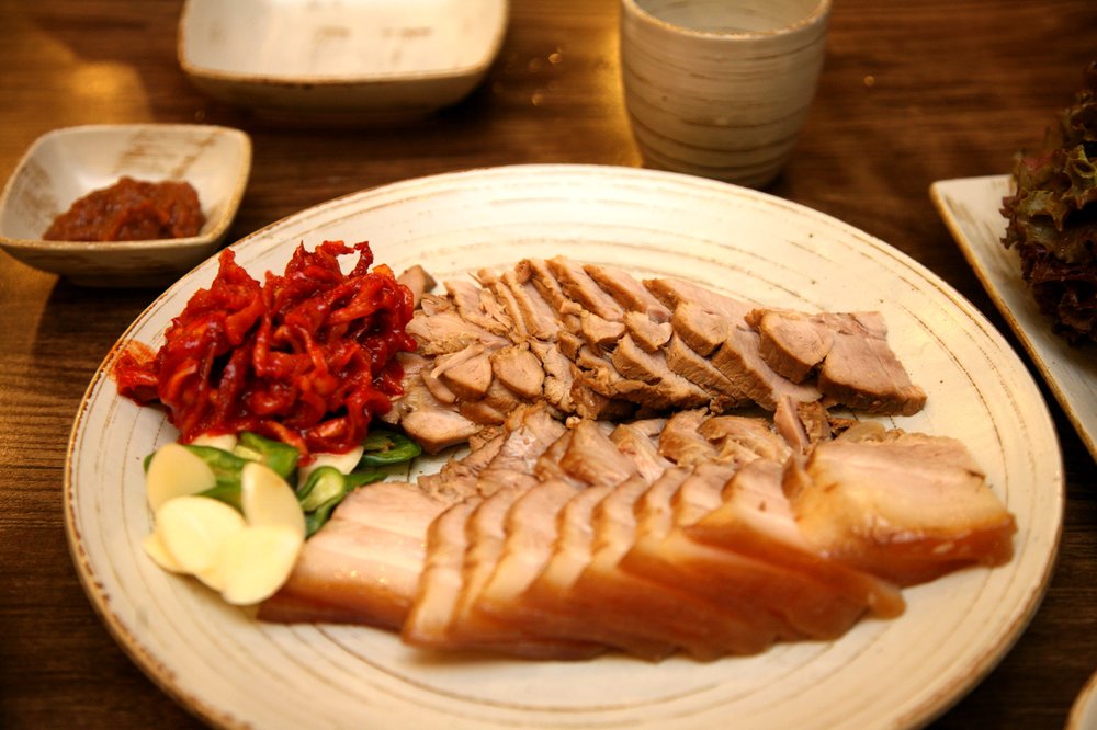 Zart gekochter Schweinebauch, der in einer würzigen Brühe mit Doenjang gegart wird. Serviert wird das Fleisch traditionell in gesalzenen Kohlblättern eingewickelt mit Rettich-Kimchi.