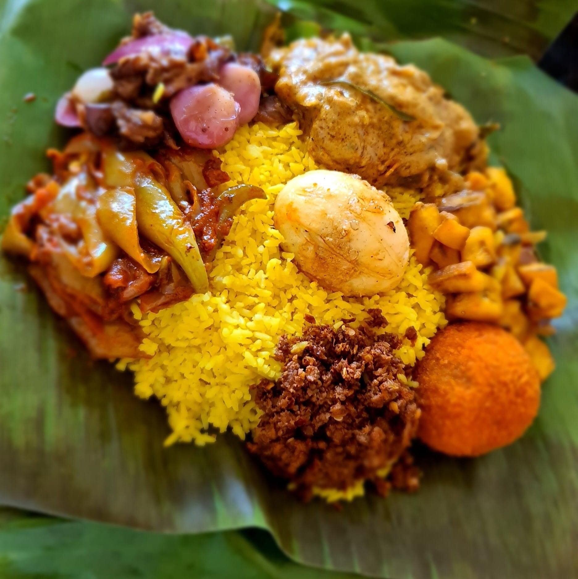 Ein Festmahl in einem Paket: Aromatischer, in Brühe gekochter Reis, vereint mit würzigem Fleisch-Curry, Frikadellen, Blachan und süß-saurem Auberginen-Pickle – alles traditionell im Bananenblatt gebacken.
