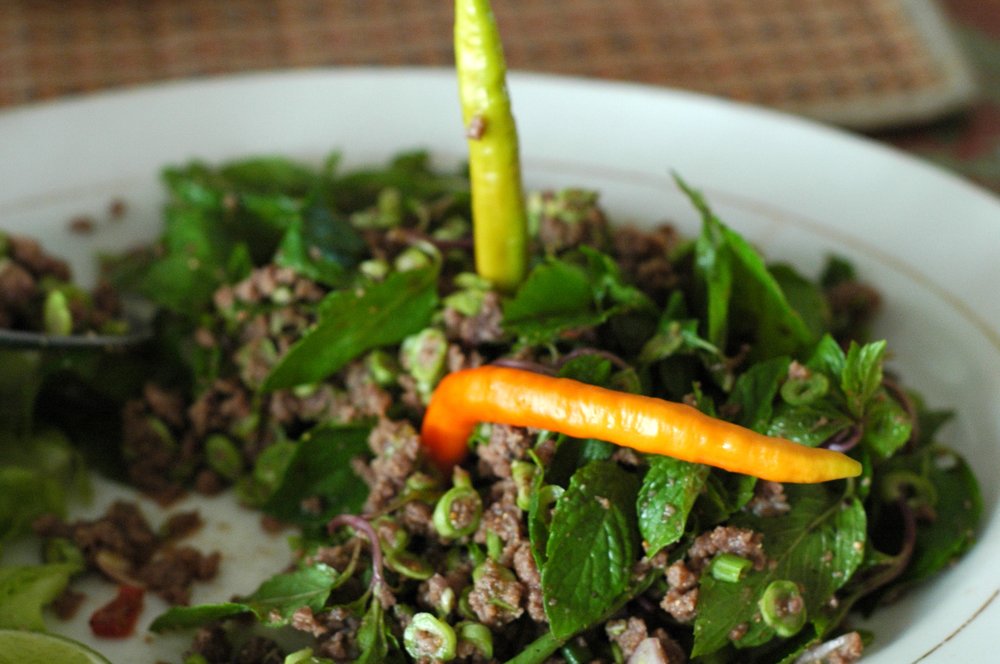 Ein feuriger Fleischsalat aus dem Nordosten Thailands (Isan) mit fein gehacktem, rohem Rindfleisch. Die Kombination aus frischen Kräutern, Limette und geröstetem Reispulver sorgt für ein einzigartiges Aroma.