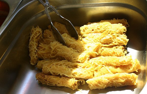 Den Vorgang wiederholen, bis der Teig aufgebraucht ist. Die fertigen Roti Jala warm als Beilage zu Curry servieren.